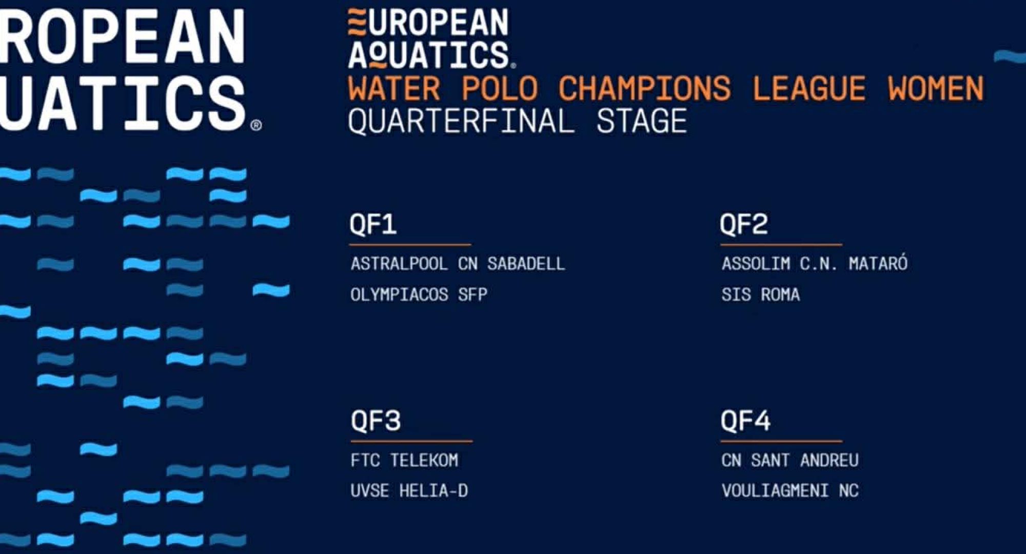 Τον αντίπαλό της στη φάση των «8» του ChampionsLeague έμαθε η ομάδα πόλο Γυναικών του Ολυμπιακού, από τη σημερινή (23/3) κλήρωση στην Κροατία, στα γραφεία της Ευρωπαϊκής Ομοσπονδίας. Στην προημιτελική φάση της κορυφαίας ευρωπαϊκής διασυλλογικής διοργάνωσης, ο Θρύλος θα τεθεί αντιμέτωπος με την Σαμπαντέλ, με πρώτο ματς στην Ισπανία, το Μεγάλο Σάββατο (11/4) και ρεβάνς στο Παπαστράτειο κολυμβητήριο, έναν μήνα μετά (16/5).