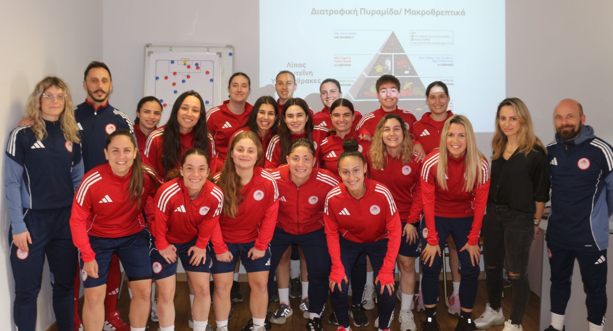 Το «παρών» στο Σεμινάριο στο Ρέντη έδωσαν οι ποδοσφαιρίστριες και το προπονητικό επιτελείο της ομάδας των «ερυθρόλευκων» και ενημερώθηκαν από την κα. Μάνθου, μέσα σε θετικό και διαδραστικό κλίμα, για τη σημασία της σωστής και ισορροπημένης διατροφής για την απόδοση, την αποκατάσταση και την υγεία.