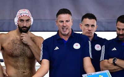 Μετά τη λήξη της αναμέτρησης με τη Μλαντοστ ο προπονητής της ομάδας πόλο Ανδρών του Ολυμπιακού, Έ...